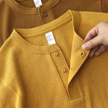 口碑好貨!華夫格亨利領男士純色寬松針織套頭打底衫休閑長袖T恤