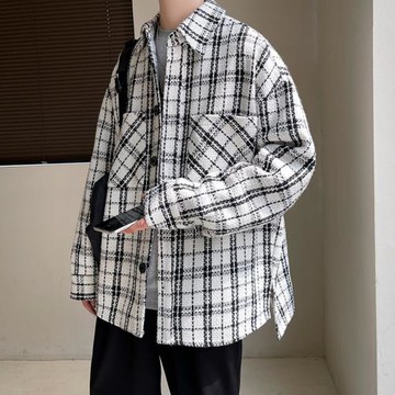 小香風格子外套男ins港風chic復古呢料上衣秋季潮流寬松翻領夾克