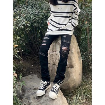 spark居民 自主AM歐美高街鑲鉆破洞牛仔褲男女燙鉆修身小腳褲潮牌