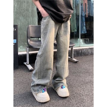 (免運)美式高街vibe復古水洗做舊黃泥染拉鏈開叉牛仔褲男直筒微喇長褲子