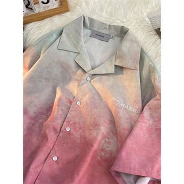 大碼300斤美式復古漸變扎染襯衫男短袖夏季設計感小眾襯衣情侶裝