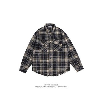 WH先生復古美式格子毛邊設計感長袖襯衫男潮牌寬松高街小眾襯衣