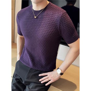 夏季針織短袖男t恤圓領薄款冰絲鏤空半袖休閑純色套頭打底衫上衣