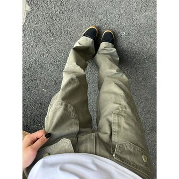 歐美hiphop炸街直筒褲子潮牌男灰綠色多口袋工裝褲顯瘦微喇休閑褲