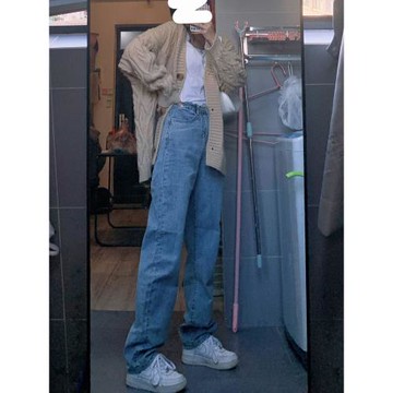 2025春秋新款女褲子藍色百搭牛仔褲寬松直筒闊腿高腰顯瘦拖地褲子