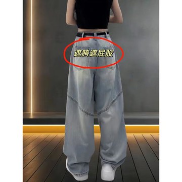 美式高街直筒牛仔褲女春季小個子寬松水洗藍色高腰顯瘦闊腿長褲子