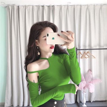 露肩上衣開肩心機女性感長袖緊身漏鎖骨T恤設計感秋季大碼打底衫
