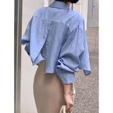 韓國chic秋季新款氣質簡約小心機后背開叉設計寬松長袖短款襯衫女