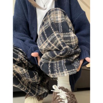復古格子褲女2024新款秋冬高腰垂感直筒休閑毛呢褲顯瘦加絨闊腿褲