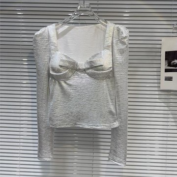 網紅同款2025秋季新款氣質名媛低方領涂層蝴蝶結立體胸墊T恤衫女