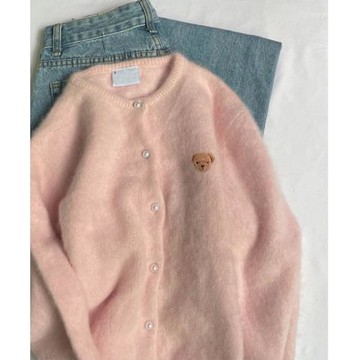 馬海毛小熊刺繡粉色針織開衫春秋季軟糯溫柔慵懶毛衣外套外搭上衣
