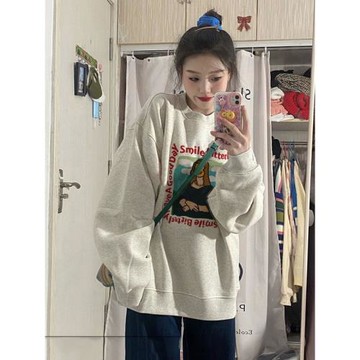 純棉國潮美式復古oversize小個子卡通衛衣女春秋薄款慵懶圓領上衣