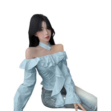 一字肩荷葉邊藍色襯衫女純欲辣妹露肩上衣高級感絕美掛脖襯衣早秋