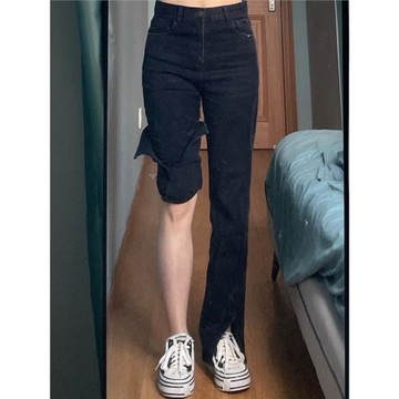 黑色開叉微喇叭牛仔褲女春秋大碼胖mm顯瘦高腰喇叭褲復古直筒長褲