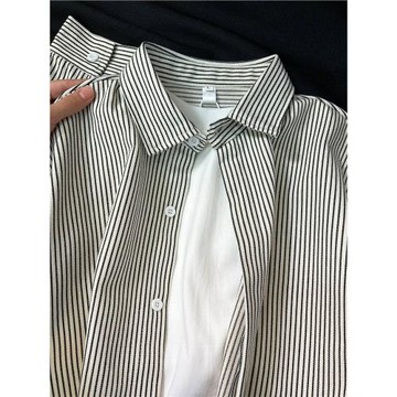 韓國chic秋季法式基礎款單排扣寬松休閑百搭小清新長袖條紋襯衫女