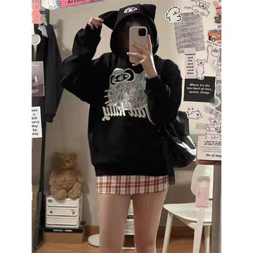 純棉國潮美式復古oversize小個子卡通衛衣女春秋薄款慵懶圓領上衣