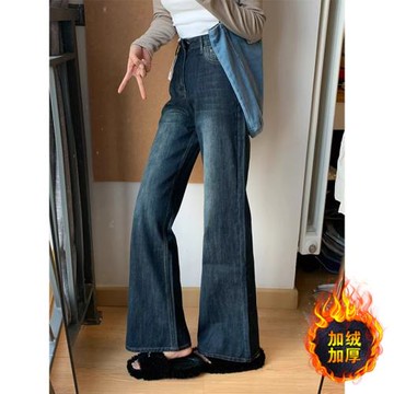 復古藍加絨加厚保暖寬松直筒牛仔褲女秋冬新款高腰顯瘦窄版闊腿褲