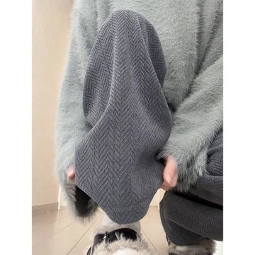 灰色雪尼爾闊腿褲女秋冬高腰垂感直筒休閑窄版加絨人字紋針織褲子