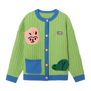 2024秋裝新款日學院風撞色設計感小眾卡通綠色加厚開衫毛衣外套