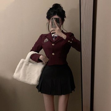 辣妹學院風套裝jk制服酒紅色外套襯衫黑色百褶裙子三件套早春新款