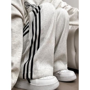 白灰色美式運動褲女春秋季2024新款休閑直筒闊腿褲寬松側條紋衛褲