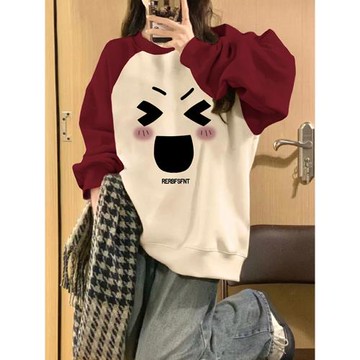 潮牌撞色插肩加絨圓領衛衣女秋季2025新款爆款寬松慵懶風甜美上衣