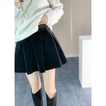 黑色百褶短裙女秋冬小個子設計感小眾金絲絨高腰顯瘦a字半身裙子