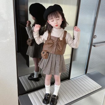 女.童小花皮馬甲裙套裝2024春秋新款兒2童裙子女寶寶韓版三件套