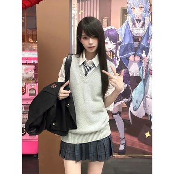 原創JK制服純色V領套頭毛衣女疊穿校供感外搭針織衫小玫格裙套裝