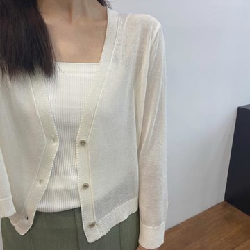 白色V領長袖冰絲防曬針織開衫外搭女秋空調衫罩衫短款披肩上衣薄