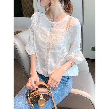 白色蕾絲襯衣女春秋2025年新款七分燈籠袖雪紡襯衫寬松遮肚子上衣