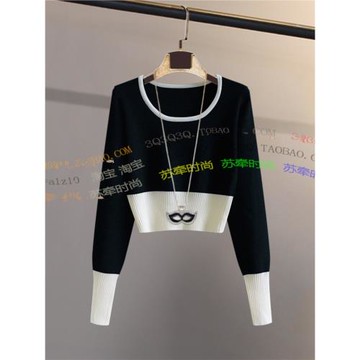 復古小香針織衫修身顯瘦打底衫長袖套頭拼色短款高腰毛衣女秋上衣