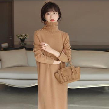 日系輕奢羊毛連衣裙女2025新款秋季修身長款毛衣裙過膝高領打底裙