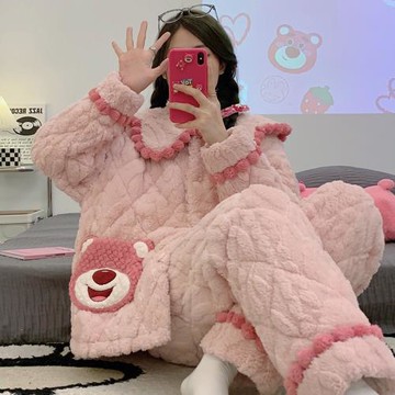 加厚加絨睡衣女冬款珊瑚絨冬季三層夾棉法蘭絨可愛小熊家居服冬天