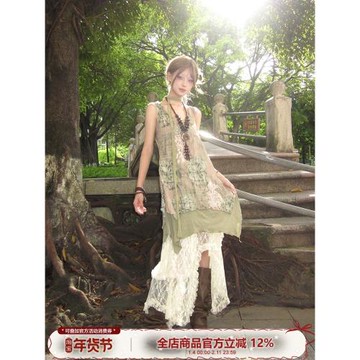 vintage古著裙女古早裙子綠色復古廢土風連衣裙西北云南中古