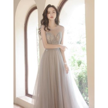 灰色抹胸晚禮服裙2024新款顯瘦仙女名媛仙氣高貴重工氣質高檔主持