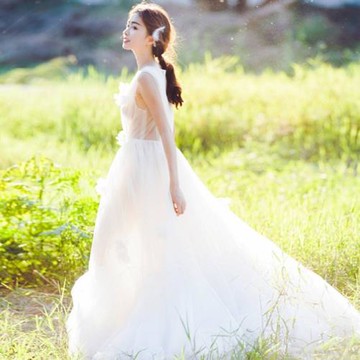 花葉蕾絲拼接V領無袖落地長襬輕婚紗