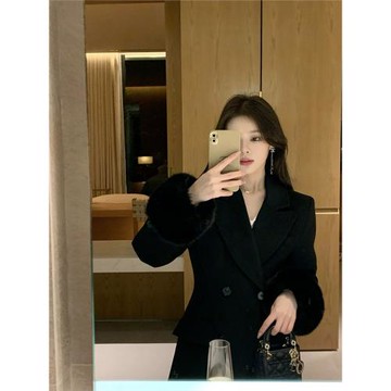 黑色修身毛呢西裝外套女2025秋冬款仿狐貍毛加厚夾棉羊毛呢子大衣