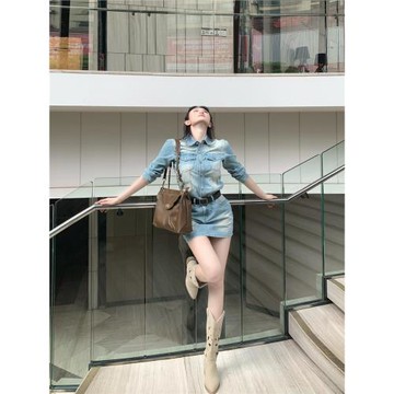 Beloved千金金 【ins美高】辣妹重工翻領美式短款收腰牛仔連衣裙