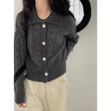 韓系麻花翻領100%羊毛針織開衫女2024秋季新款寬松慵懶風毛衣外套