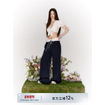 LaluneDuCiel 可拆卸綁帶腰頭休閑運動褲女夏季闊腿寬松直筒褲子