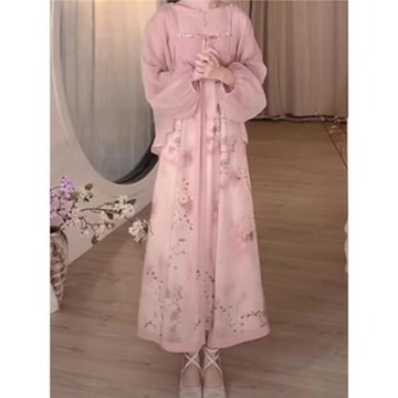 煩惱心粉紅色中國結真絲長裙