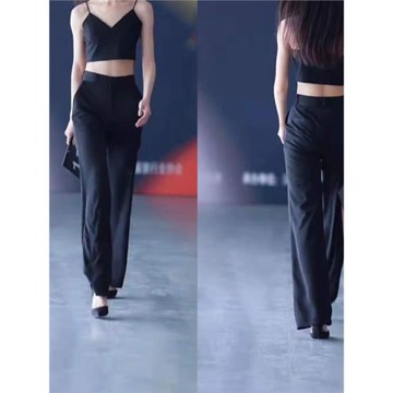 時裝周走秀款深藍色垂感高腰直筒褲女氣質闊腿褲時尚長褲夏季褲子