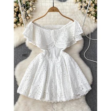 復古氣質一字肩露肩荷葉邊收腰顯瘦a字鏤空連衣裙海邊度假沙灘裙