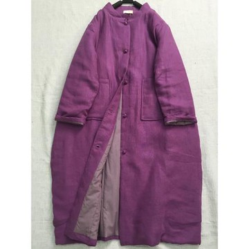 靜家 冬季新款砂洗紫色亞麻中式對襟加厚棉襖風衣 盤扣長款棉衣