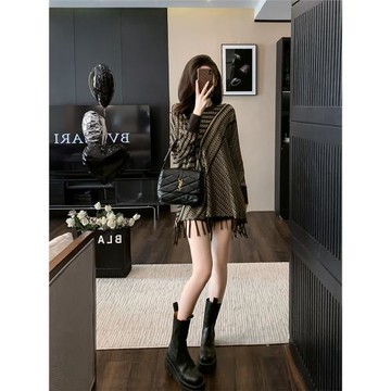 慵懶風秋冬季圓領蝙蝠袖套頭毛衣外穿寬松中長款上衣流蘇邊連衣裙