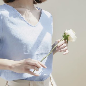 夏季天然透氣亞麻短袖襯衫女寬松T恤衫套頭V領純色上衣打底衫百搭
