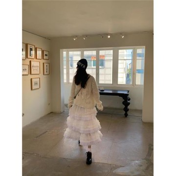 白色歐根紗 可愛流蘇花邊 中長款半身裙