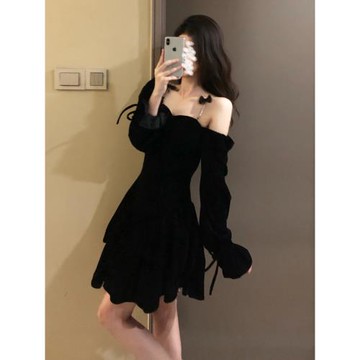赫本風高級感絲絨小黑裙女秋冬季法式在逃公主收腰氣質蓬蓬連衣裙