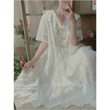 點我下載原創夏季荷葉邊鑲珍珠短袖寬松大碼白色法式蕾絲連衣裙娃娃裙女